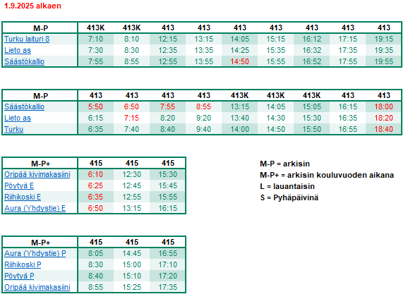 Earlier departure times and other minor schedule adjustments to weekday timetables for routes 413 (Aura–Turku) and 415 (Oripää–Pöytyä–Aura) starting from September 1, 2025