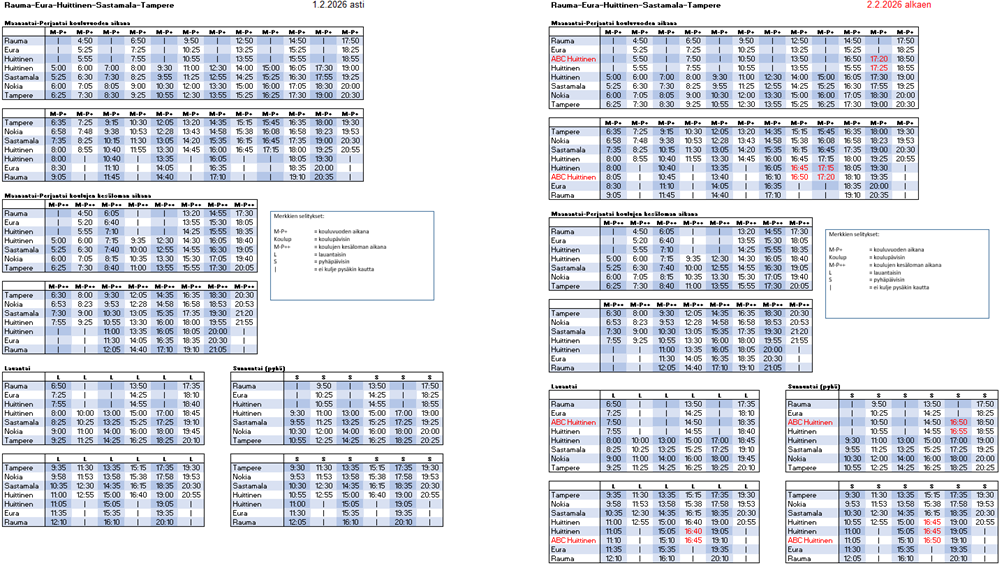 Ändringarna syns i reseplaneraren på seutuplus.fi samt i sidans avsnittet Tidtabeller. Välj tidtabellsperioden Vår 2026/2 i sidans övre högra hörn.