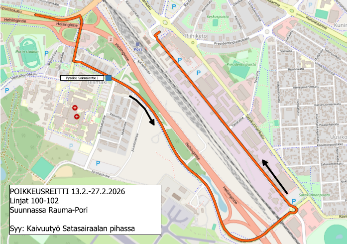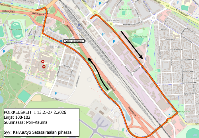 Satasairaalan piha-alueella tehdään kaivuutöitä, joiden vuoksi linjat 100–102 eivät voi ajaa normaalireittiä sairaalan kautta. Bussit siirtyvät poikkeusreitille perjantaista 13.2.2026 alkaen. Poikkeusreitti on käytössä arviolta noin kahden viikon ajan töiden keston mukaan.