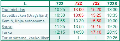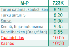 Alkaen 1.7. linja 723K kesän arkiliikenteessä klo 8:10 Turusta ajaa Taalintehtaan kautta Kasnäsiin. Reittimuutoksella mahdollistetaan paremmat asiointiyhteydet Taalintehtaalle.