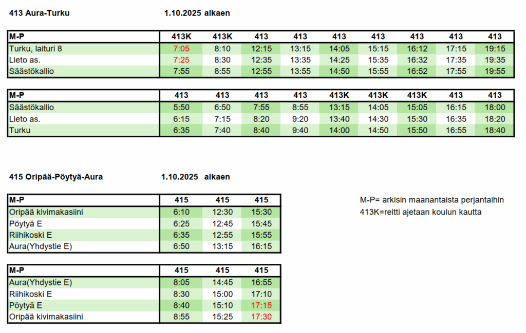 Pieniä aikataulumuutoksia linjoille 413 (Aura-Turku) ja 415 (Oripää-Pöytyä-Aura) 1.10.2025 alkaen